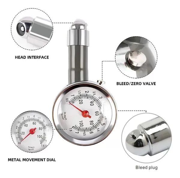Con un diámetro de 50 mm, este calibre es fácil de manejar y transportar, lo que lo convierte en una herramienta práctica para llevar en tu vehículo o bicicleta. A pesar de su tamaño compacto, es capaz de medir hasta 100 psi, cubriendo así las necesidades de la mayoría de los vehículos y bicicletas.