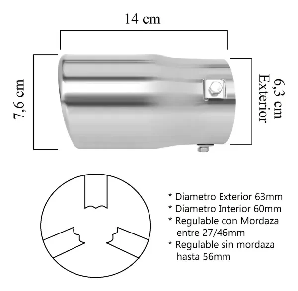 A tener en cuenta; este modelo en especial es para usarlo con escape salida recta y los diámetro correspondientes para ajustar con la mordaza son entre 27/46mm. También es posible ajustarlo sin mordaza y directamente con tornillos, pero el diámetro máximo es de 56mm.