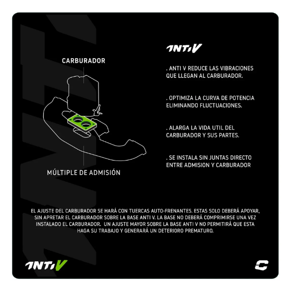 * Esta base reduce las vibraciones en el carburador, mejorando su rendimiento y maximizando la vida útil del carburador. Además evita el desgaste de piezas del carburador por vibración.